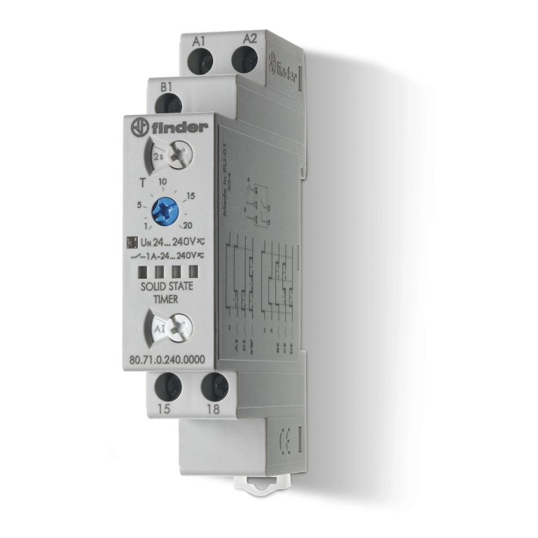 Moodulaegrelee 80.71, 6 funktsiooni, 1NO (pooljuht 1A AC-15), 0.1sek-24h, 24-240VAC/DC, Finder