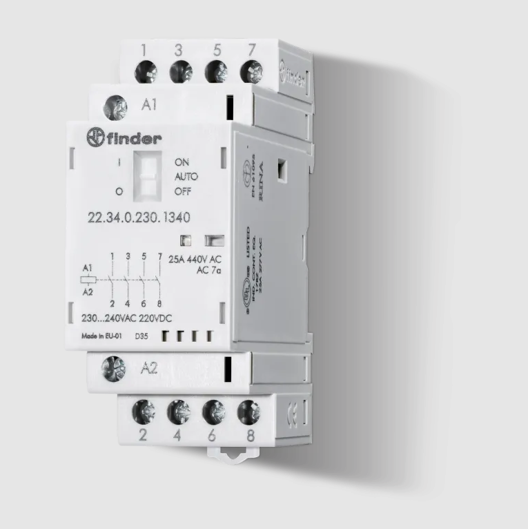 Moodulkontaktor, 2NO+2NC, 25A, AgSnO2, 230VAC/DC, 2mod, Auto-On-Off, Finder