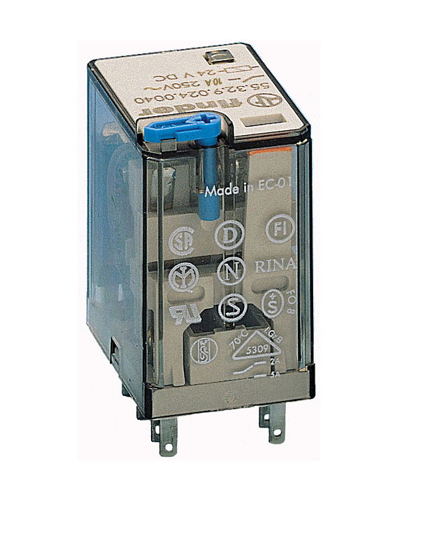 Relee 55.32, 2CO, 10A, 24VDC (40mA), LED+TEST+ meh.ind.+ diood (+A1), pesa 94 seeria, Finder