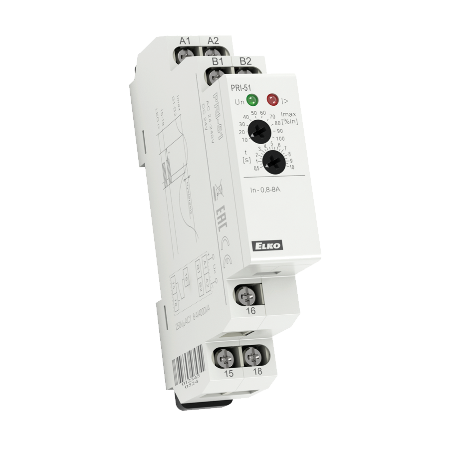 Voolukontrollirelee PRI-51, 1F, Max, 0.8 -8A AC, 1CO, viivis 0.5-10sek, 24-240VAC, 24VDC, Elko